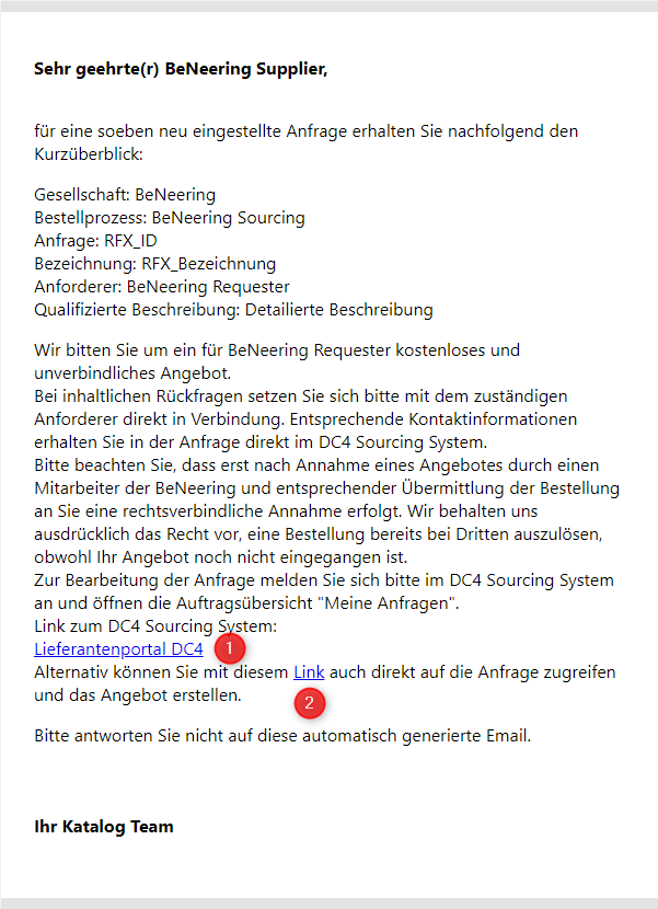 Wenn ein Kunde eine Beschaffungsanfrage (Sourcing-Anfrage) an einen Lieferanten sendet, wird eine E-Mail-Benachrichtigung an den Lieferanten gesendet, in der er um die Abgabe eines Angebots gebeten wird.