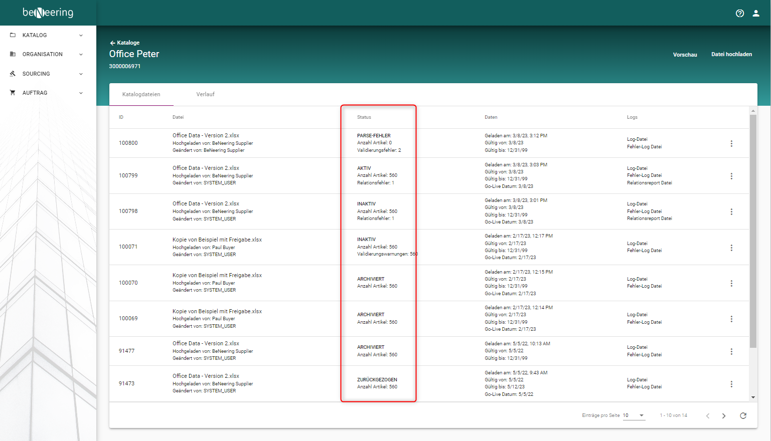 Der Katalogstatus in der Kataloghistorie bezieht sich auf die zuletzt geladene Katalogversion und kann folgende Werte beinhalten: