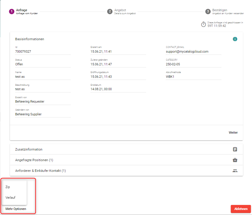 Sie können die gesamte Beschaffungsanfrage im ZIP-Format herunterladen. Klicken Sie im Bereich "Anfrage" auf "Mehr Optionen" (unten links) und wählen Sie dann "Zip".