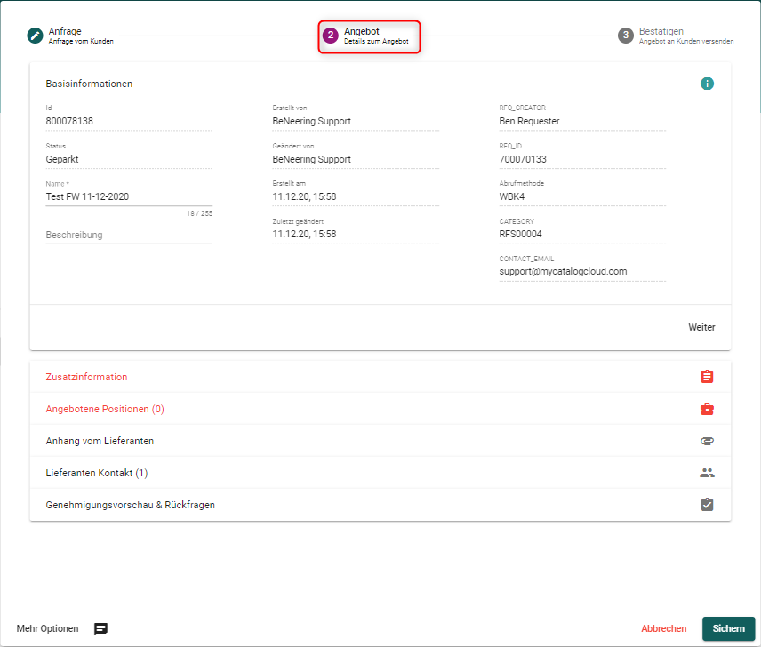 Basisinformationen | Allgemeine Informationen über die Anfrage wie Name, Beschreibung, Ausschreibungsnummer, Stauts usw. |