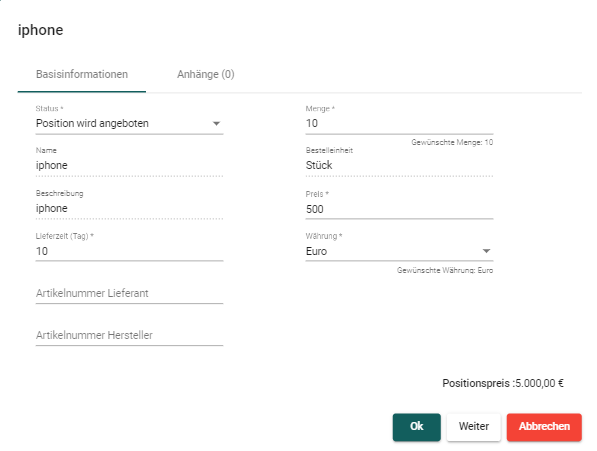 Position wird angeboten –Kundenwunsch akzeptieren. Als Nächstes müssen Sie fehlende Informationen, wie Preis, Währung usw., eingeben. Achten Sie auf die Vorschläge unterhalb des Eingabefeldes.