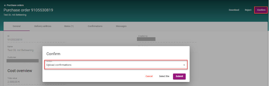 Wählen Sie die Bestellung aus, für die Sie Bestätigungen hochladen möchten, klicken Sie auf die Schaltfläche "Bestätigen" auf der Bestellung und wählen Sie die Aktion "Bestätigungen hochladen".