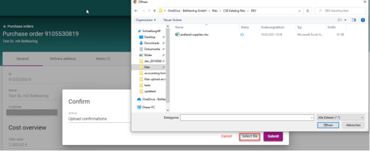 Es ist möglich, einen ganzen Satz von Bestätigungen für eine ausgewählte Bestellung hochzuladen, indem Sie eine Excel-Datei hochladen. Eine solche Excel-Datei kann eine an Ihre Kundenbedürfnisse angepasste Struktur haben. Mit einem einzigen Upload können Sie zum Beispiel mehrere Bestätigungen in einem einzigen Batch-Lauf erstellen. Eine solche Excel-Datei kann auch zusätzliche Kundenfelder wie Preisfaktoren und andere enthalten.