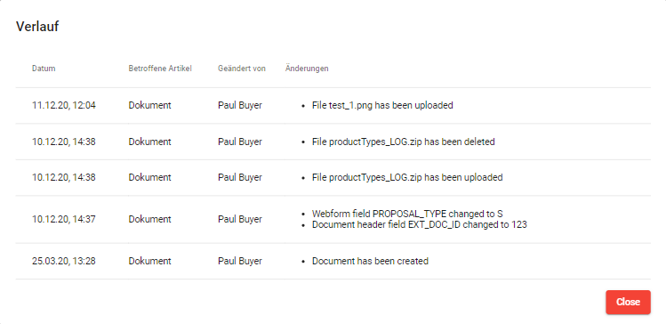 Das Verlaufsprotokoll zeigt eine Liste der in der Vergangenheit für dieses Sourcing Event durchgeführten Aktionen an.