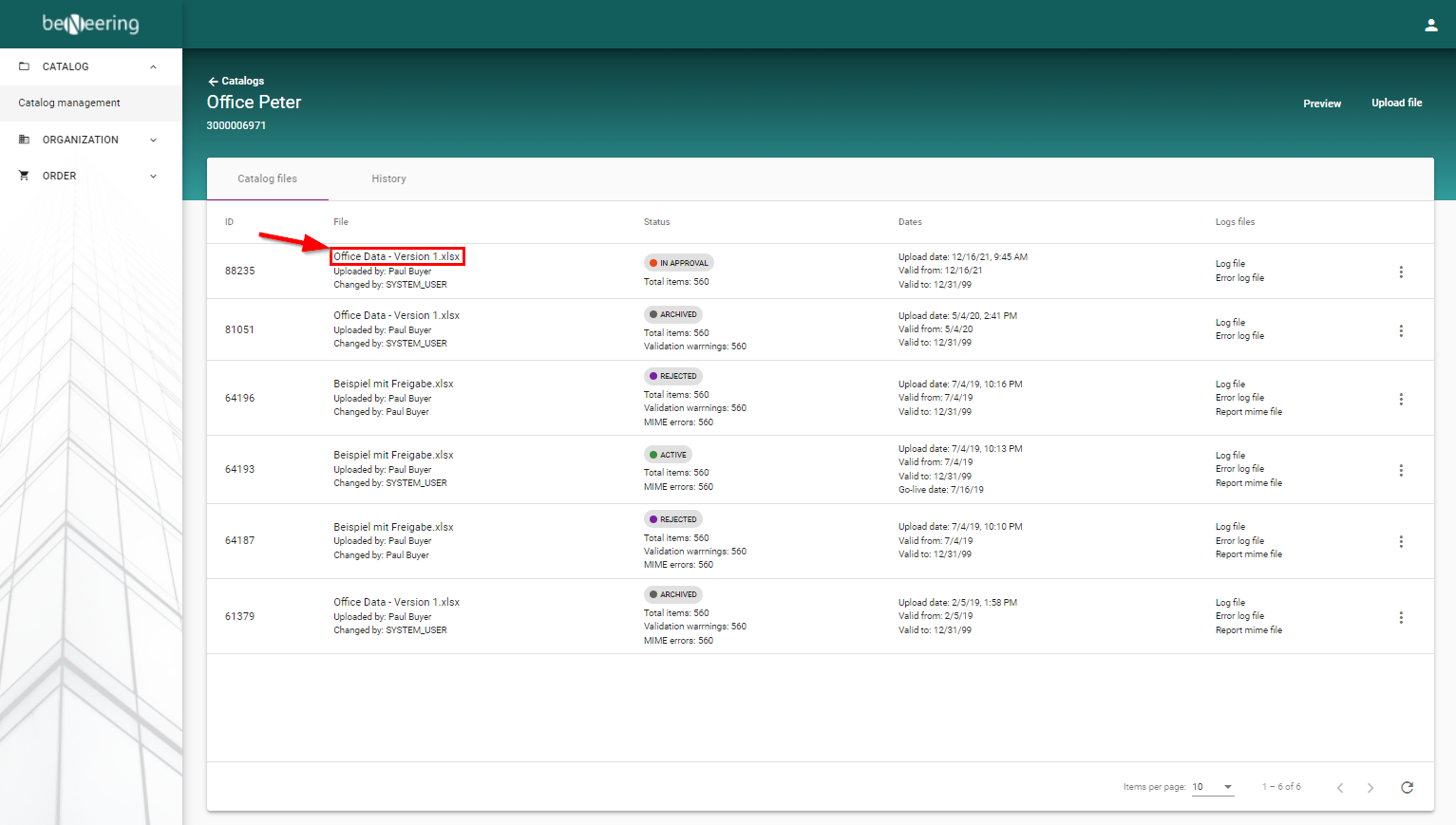 After the catalog container has been selected, you will see a list of catalog files. This list shows the history of catalog files that have been uploaded for this container.