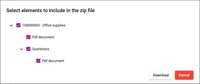 You can tick which documents you would like to download. After clicking the Download button, all selected documents will be downloaded in a single ZIP file.