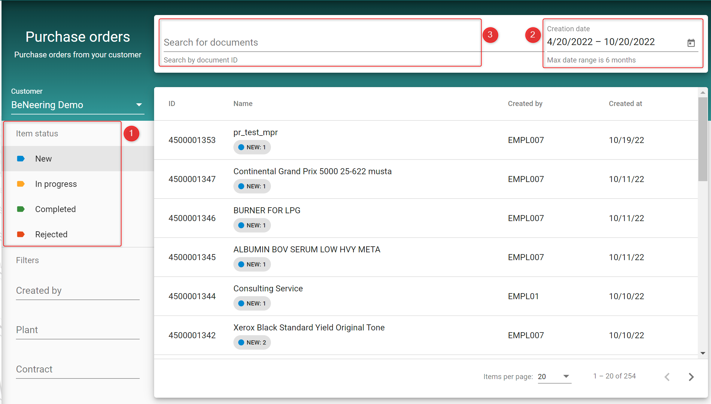 Please check all filters (1), the right time period (2) and then search for the PO number (3). If you have the PO number, the system will find the PO even with a wrong time period. But then make sure, that you check the filters (1).