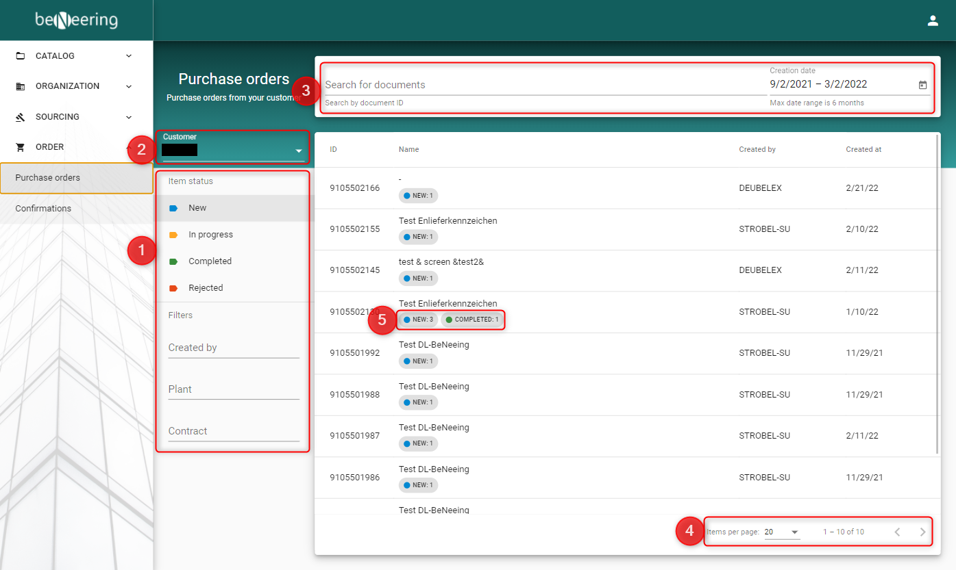 In point (3) you can search for purchase order documents by document id or purchase order name. Another way to limit your list of Purchase Orders is to use the date picker located next to the search bar.