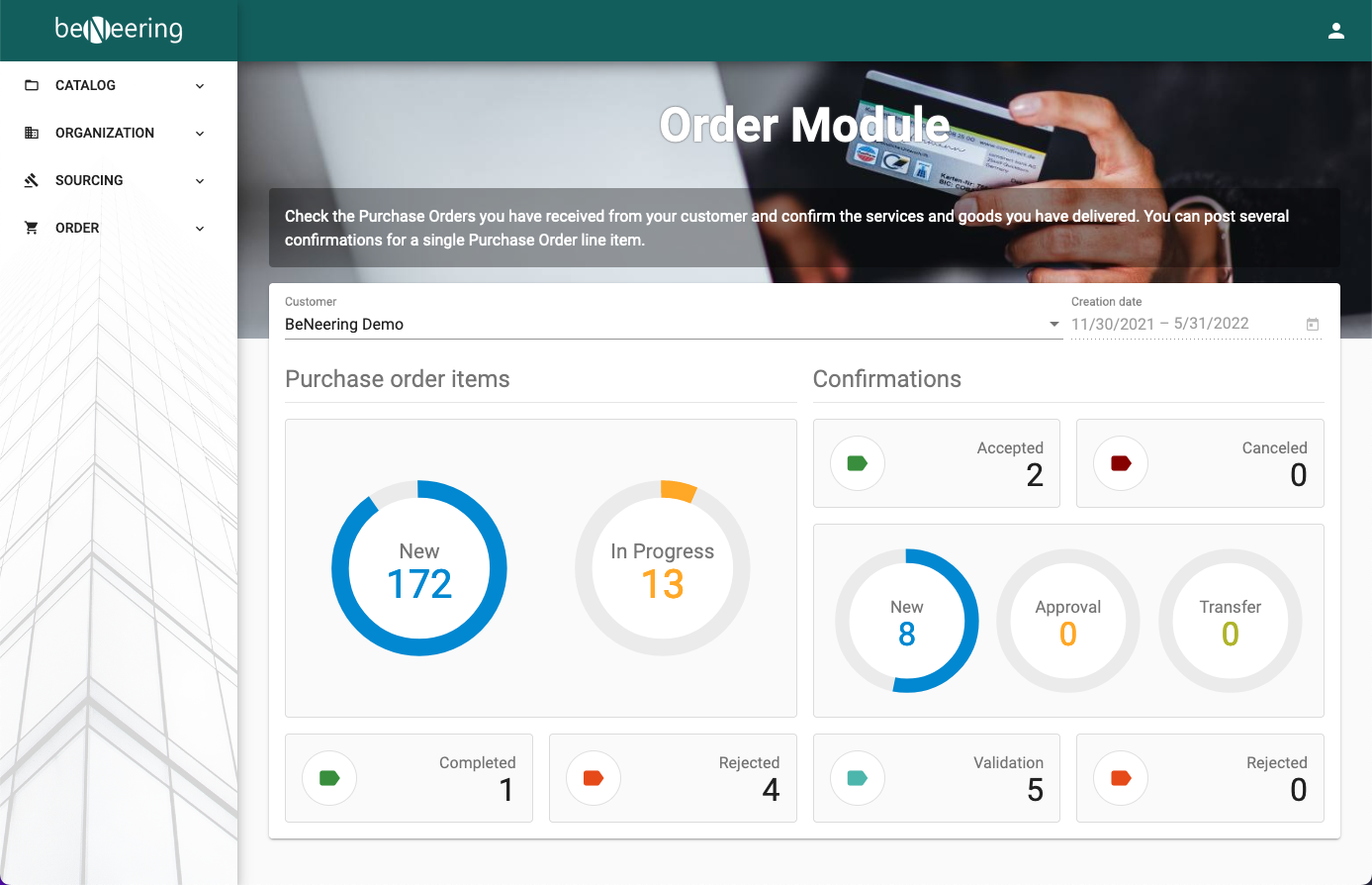 After selecting the ORDER module on left navigation pane, you can see a summary of Purchase Orders on the dashboard. If your profile is assigned to more then one customer, make sure you are selecting the customer on the dashboard first. The dashboard is showing separate tiles of Purchase Orders and Confirmations with status filters assigned to it.