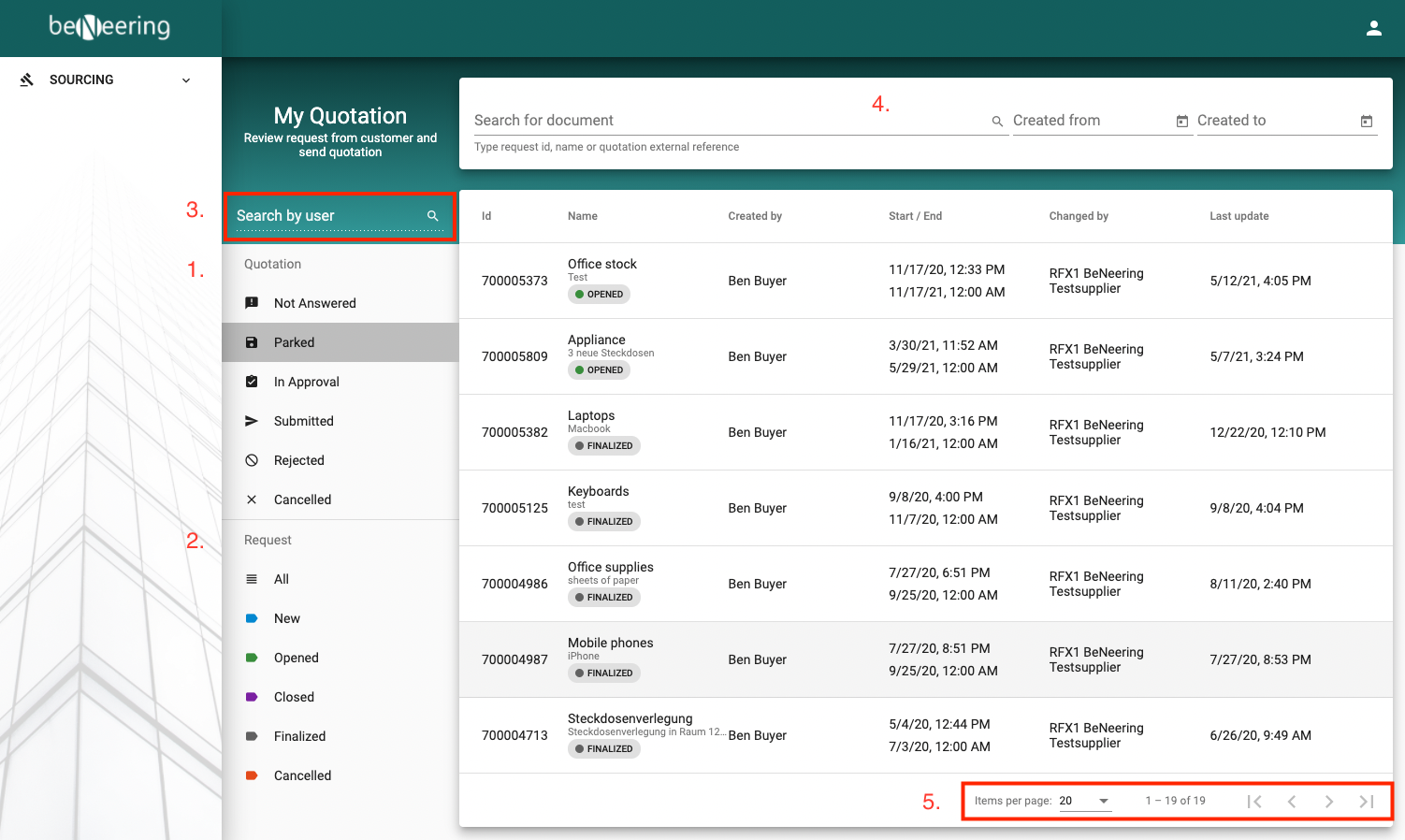 The list of Sourcing documents can be filtered by Quotation status (1.) and by Request status (2.).