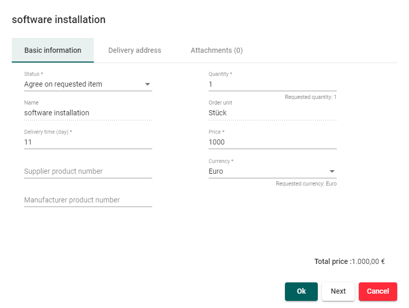 Agree on requested item – Accept Customer requirements. Next you will need to provide missing information, like price, currency, etc. Watch out for suggestions below the input field.