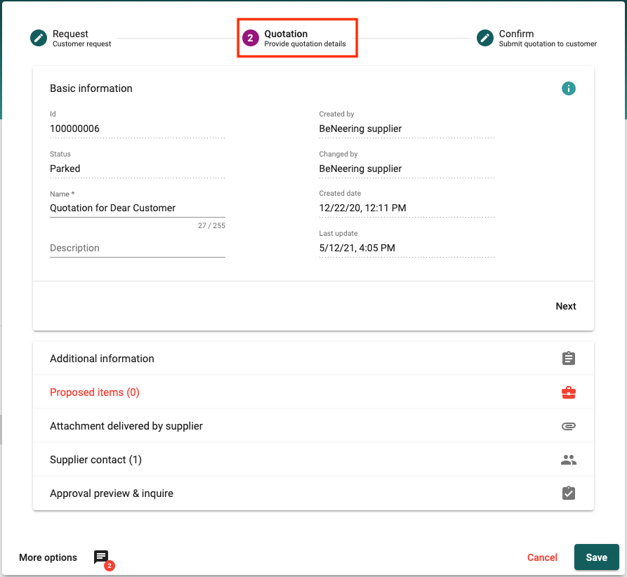 Approval preview & inquiry | This section is only visible if approval workflow has been activated by your customer for the quotation process. If this section is visible, then you will see the current status of approval. |