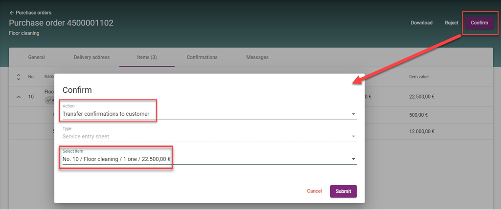 As a next step you have to select the Purchase Order item and then the confirmations to be transferred to the customer system. You can select a batch of confirmations that will be transferred on same click. Once you click on submit, then the selected batch of confirmations is transferred to the customer, considering a recalculation of prices and price factors if needed.