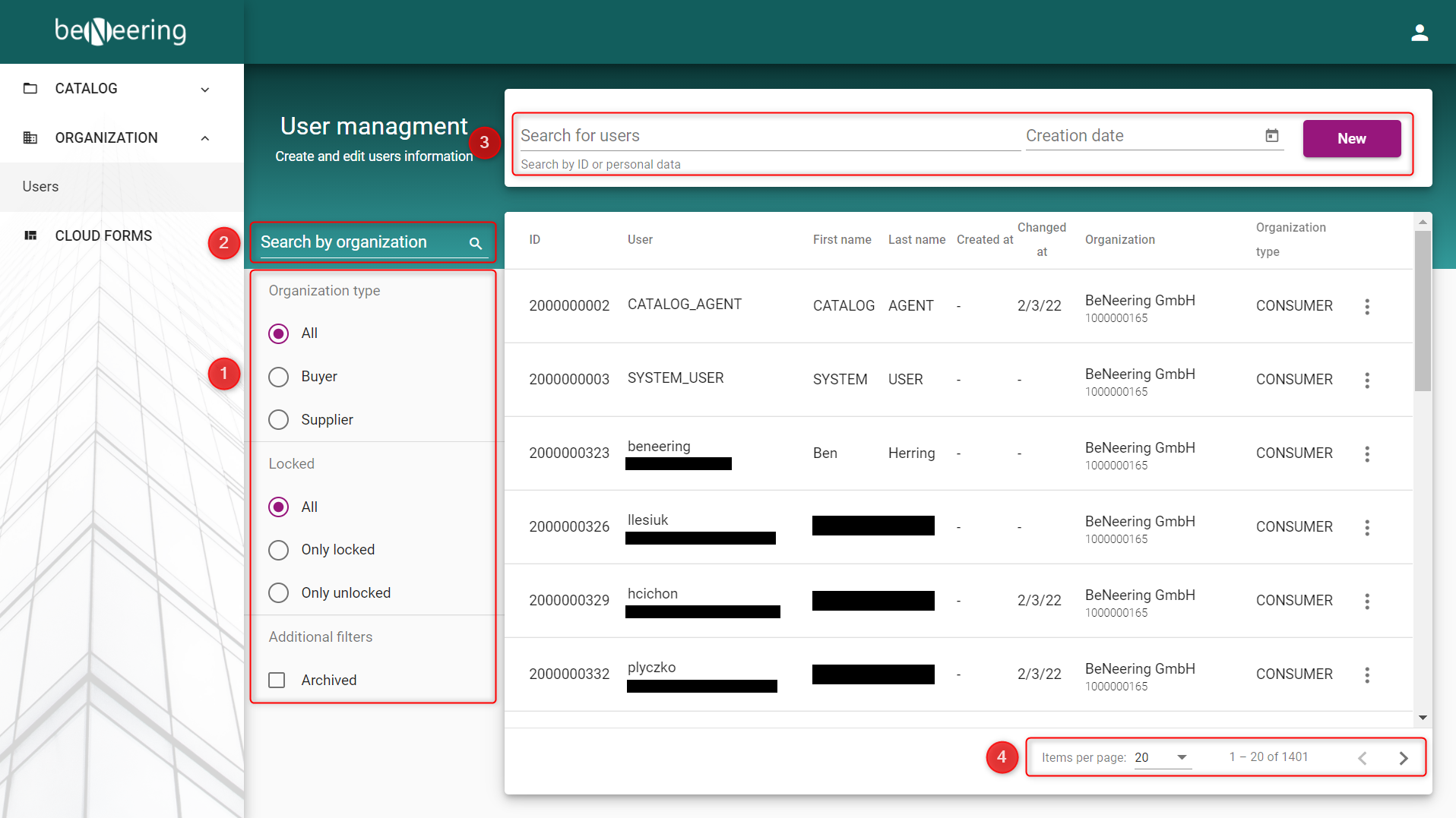 In point (3) you can search for users by user id, personal data. Another way to limit your list is to use the date picker located next to the search bar.