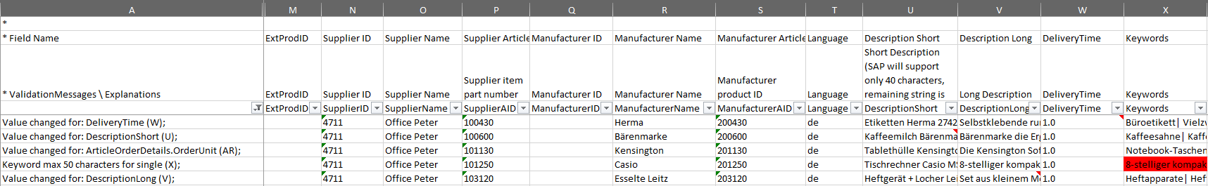 Column (A) "ValidationMessages \ Explanations" contains the messages that were detected during validation. These can be sorted using the Excel filter function and can also be corrected directly in the log file.